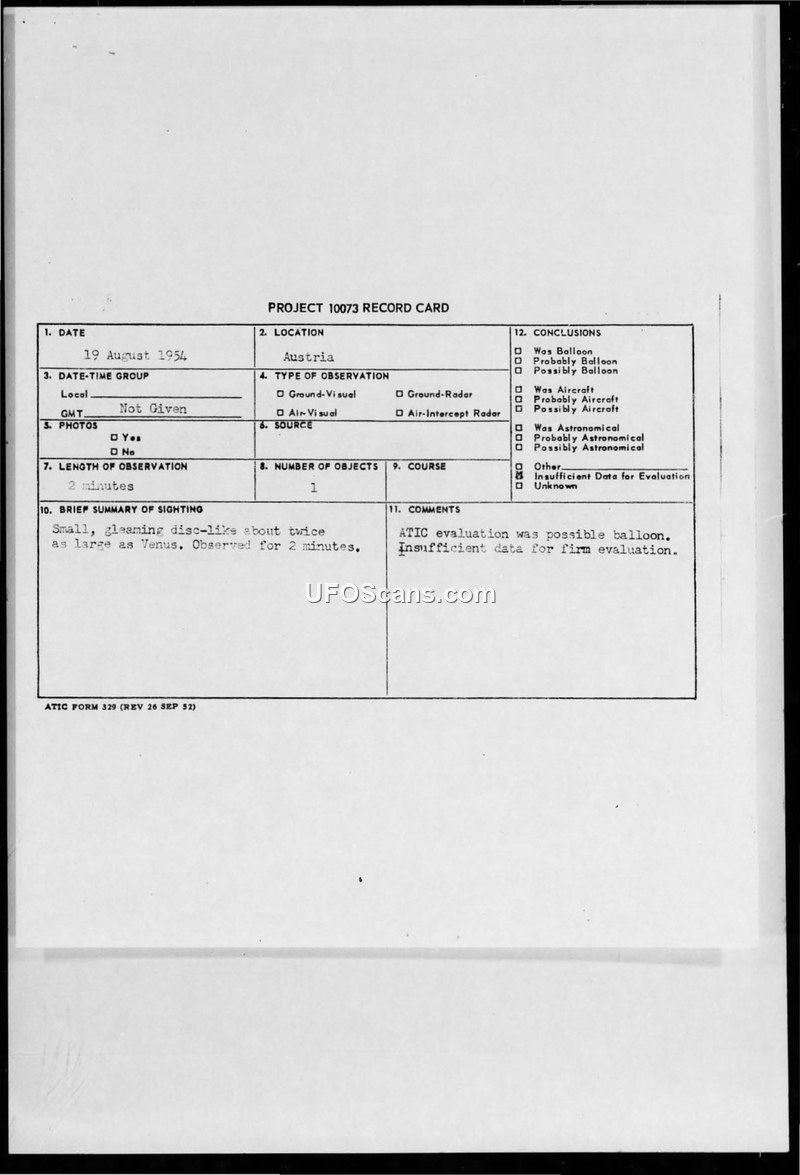 A record card from Project 10073 documenting a 1954 sighting in Austria of a small, disc-like object. ATIC investigators determined there was insufficient data to reach a firm conclusion, though a balloon was considered a possibility.