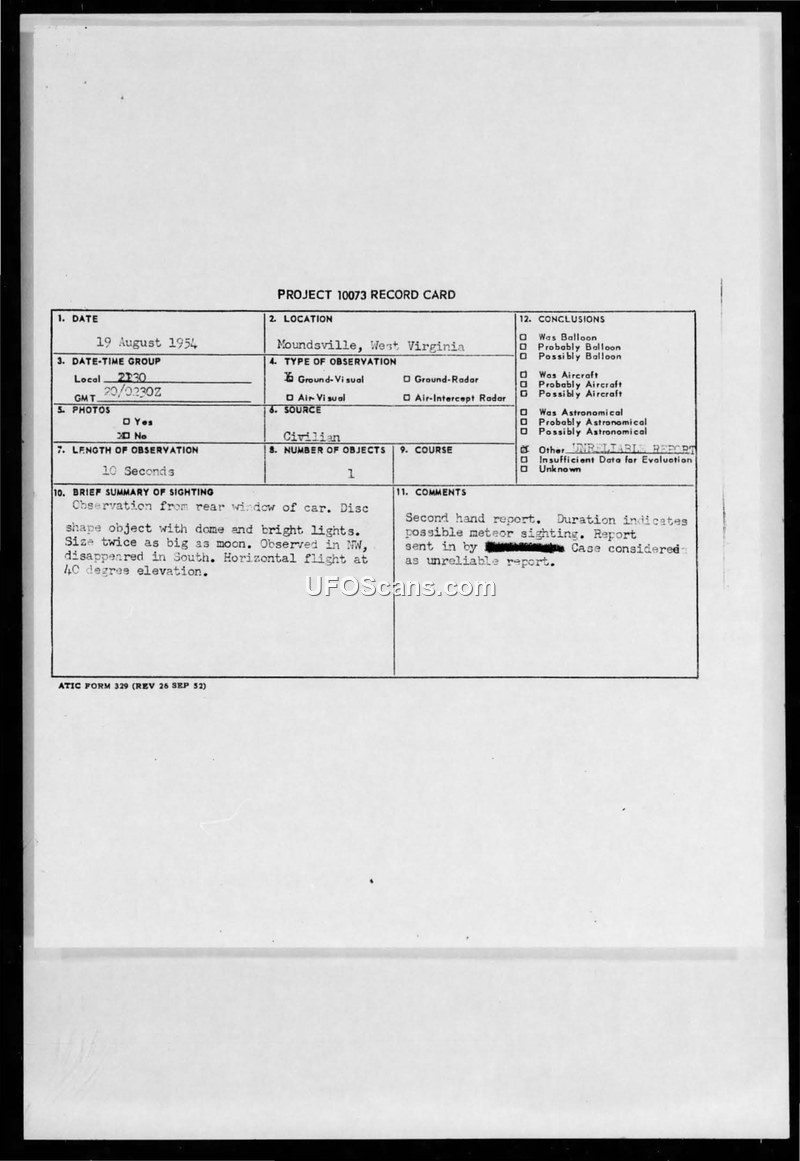 A 16-year-old reported a disc-shaped object in West Virginia on August 19, 1954. The Air Force evaluated the report as unreliable, suggesting it was likely a meteor.