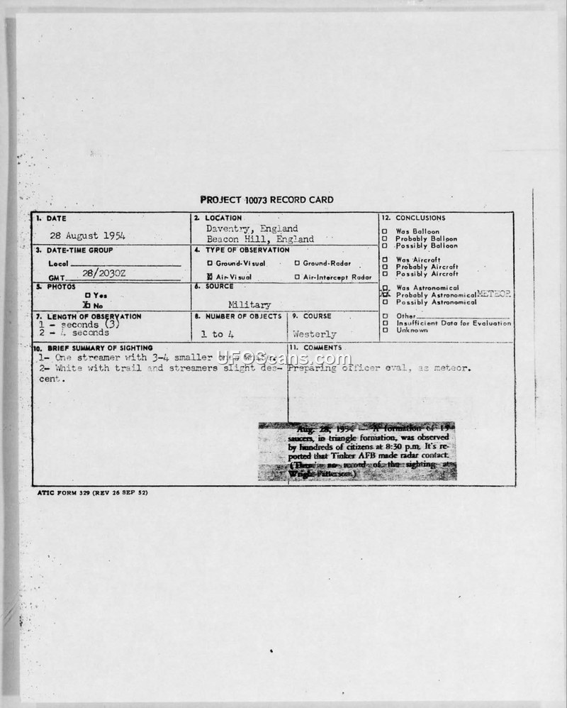 This document collection centers on a UFO sighting report from 28 August 1954, involving a C-47 aircraft over England. The primary sighting report, filed under Project 10073, describes a football-shaped, white object with streamers observed by a military pilot, Captain Robert Dueolsky, while flying at 7,500 feet. The object was reported to have a westerly flight path and was visible for approximately four seconds before disappearing. The official conclusion reached by the Air Technical Intelligence Center (ATIC) was that the phenomenon was likely a meteor, specifically referencing the Perseids or Leonides meteor showers. The collection also includes correspondence from 1960 between James Maney of 'Interplanetary Intelligence' and Lt. Colonel Lawrence J. Tacker of the USAF. Maney sought information regarding a separate, alleged 1954 sighting over Oklahoma City, as well as general inquiries about Air Force policy on firing at UFOs and the exchange of UFO information with friendly nations. Colonel Tacker and Colonel Philip G. Evans responded by clarifying that ATIC had no record of the Oklahoma City incident and that there was no official order authorizing pilots to fire on unidentified flying objects, though they acknowledged that misinterpretations by pilots had occurred in the past. The documents illustrate the administrative process for handling UFO reports and the Air Force's efforts to address public inquiries during the late 1950s and early 1960s.