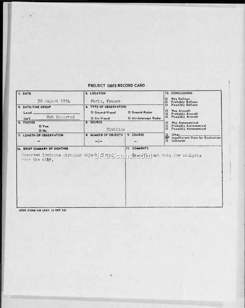 Project 10073 Record Card — Paris, France, 30 August 1954