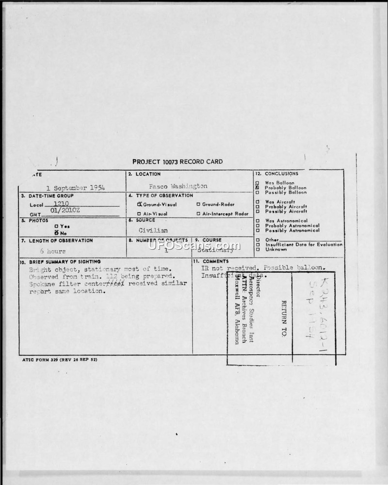 Project 10073 Record Card: Sighting near Pasco, Washington, 1 September 1954