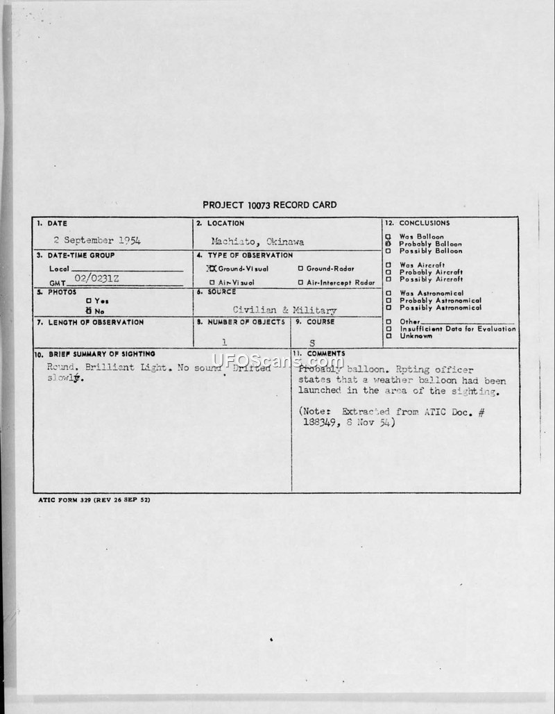 A 1954 sighting report from Okinawa describes a round, silent, drifting light. The event was officially concluded to be a weather balloon.