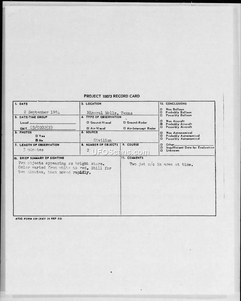 This document comprises a Project 10073 record card and associated teletype correspondence regarding an Unidentified Aerial Phenomena (UAP) sighting that occurred on 2 September 1954 near Mineral Wells, Texas. The witness, identified as a US Army Reserve officer and US Department of Agriculture employee, observed two objects while on horseback. He described the objects as appearing like bright stars with no definable shape, tail, or exhaust. The objects remained stationary for approximately two minutes, during which time their light intensity varied and their color shifted between white and red. Following this period, the objects moved rapidly to the north and faded from view. The observer estimated the objects' size to be comparable to a pea held at arm's length. The investigation, conducted by military authorities, confirmed that weather conditions were clear with unrestricted visibility. Authorities contacted Mineral Wells Radio and determined that while two jet aircraft were in the area at the time, the observer's military background made him familiar with aircraft characteristics, leading investigators to discount the jets as the source of the sighting. Furthermore, it was confirmed that no weather balloons were launched from the local municipal airport during the time of the incident. No physical evidence was discovered, and no interception action was taken. The report concludes that the cause remains unidentified, as the possibility of jet aircraft was dismissed based on the witness's expertise.