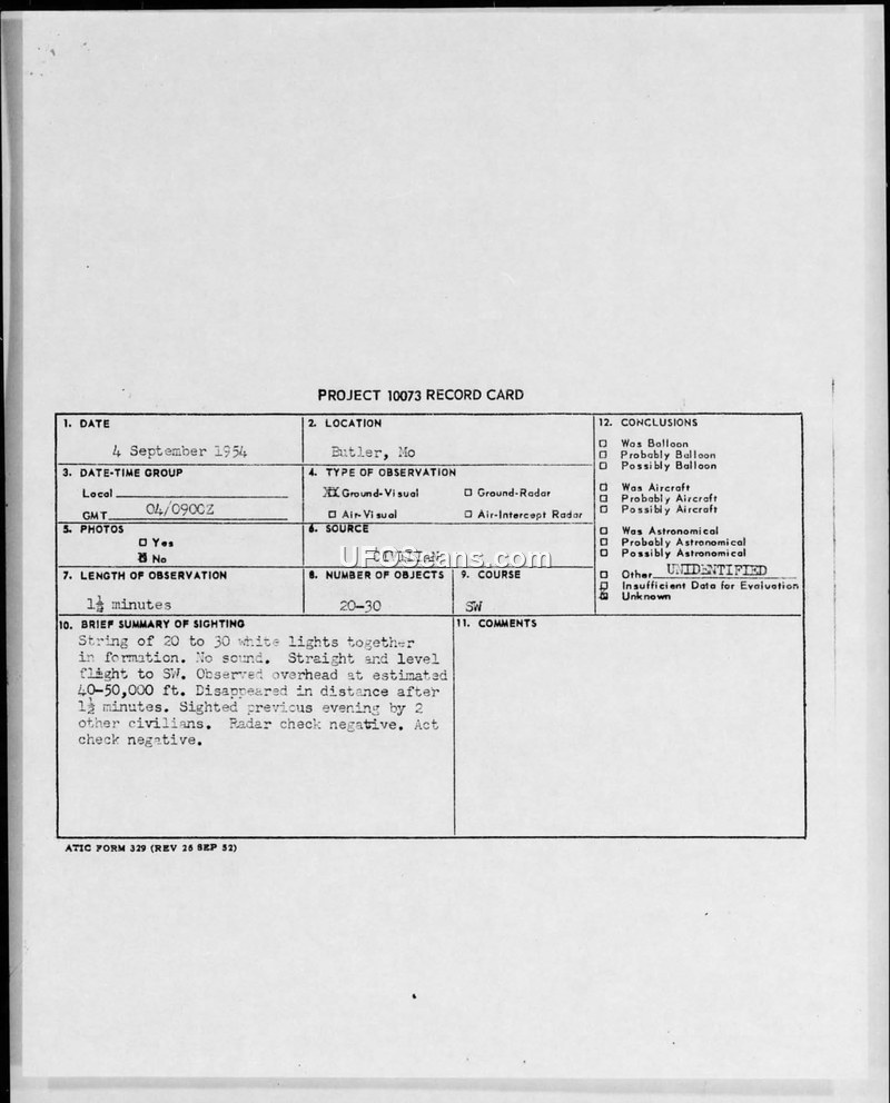 This document contains a series of Project 10073 record cards and related military communications regarding Unidentified Aerial Phenomena (UAP) sightings in Butler, Missouri, in early September 1954. On 4 September 1954, a group of 20 to 30 white lights in formation was observed by civilians moving in a straight and level flight path toward the southwest at an estimated altitude of 40,000 to 50,000 feet. The observation lasted approximately 1.5 minutes. A subsequent sighting occurred on 5 September 1954, involving a single silver-to-white object with a slight sweep-back line, which was observed for 25 to 30 seconds. This object also moved in a straight and level flight path toward the southwest before veering to the south and disappearing. In both instances, radar checks by GCI sites 'Picnic' and 'Mastiff' were negative. Kansas City ARTC confirmed that a B-47 aircraft was in the vicinity at the time of the 5 September sighting, flying at an altitude between 34,000 and 39,000 feet. The document also includes an excerpt from a CRIFO newsletter regarding 'Case 22' in Rockford, Illinois, dated 5 September 1954. In this incident, amateur astronomers Peter Bartkus and Theodore McColm observed a spherical object through a telescope while watching the moon. They estimated the object to be 12,500 feet in diameter and traveling at 1,081 mph. They concluded the object was a powered body in space, as it was ascending while the moon was descending. The editor of the newsletter used this incident to argue against the notion that 'saucer' vehicles are confined to the Earth's atmosphere, suggesting they may be extraterrestrial and using the moon as a 'hopping-off point.' The official conclusion for the Butler, Missouri sightings remained 'UNIDENTIFIED,' with investigators noting that the witness for the 5 September event had also reported a sighting the previous night, though the descriptions of the objects were inconsistent.