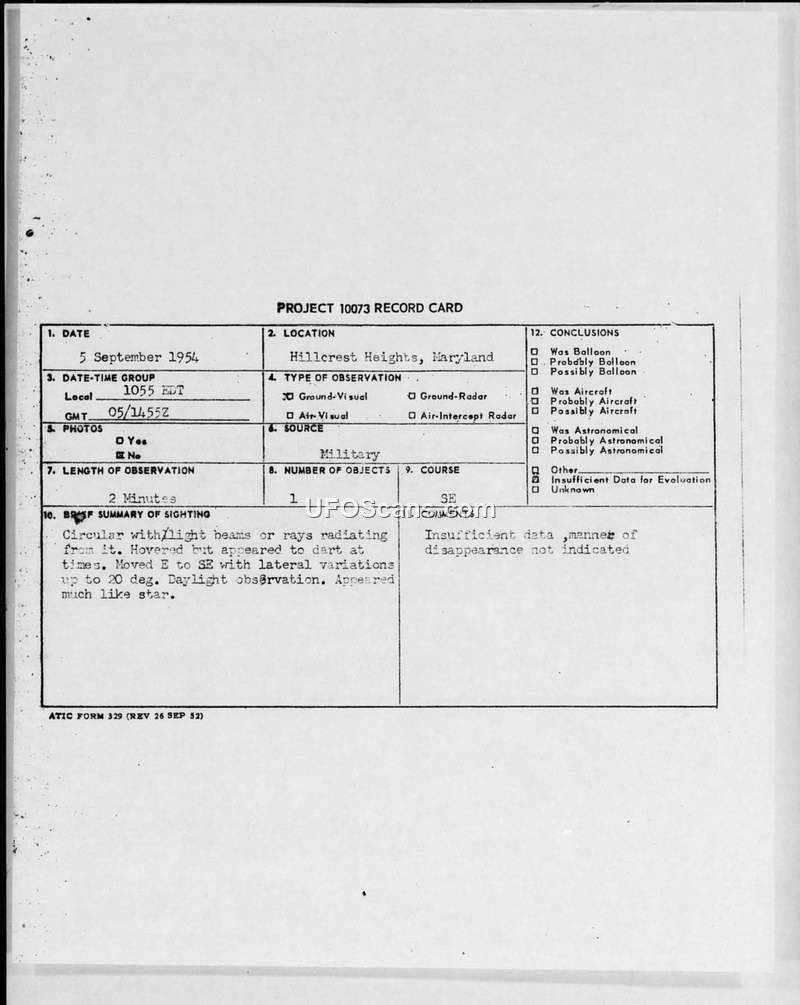 This document consists of a Project 10073 record card and an associated teletype message regarding an unidentified aerial phenomenon sighting on 5 September 1954. The incident occurred at 1055 EDT in Hillcrest Heights, Maryland, an area situated between Bolling and Andrews Air Force Bases. The witness, identified as a Major in the United States Air Force with 13 years of flight experience, reported observing a single, circular object. The object was described as a white light with a slight yellow tint, appearing similar to a star, with a size comparable to an aircraft recognition light viewed at 2000 feet. The observer noted that the object emitted light beams or rays. During the two-minute observation, the object was seen hovering and then darting with lateral variations of up to 20 degrees, moving generally from East to Southeast. The observer estimated the altitude to be between 10,000 and 50,000 feet. Weather conditions were reported as CAVU (Ceiling and Visibility Unlimited). The observer explicitly stated their belief that the object was not an aircraft. The official conclusion recorded on the project card is that there was insufficient data to evaluate the sighting, and the manner of the object's disappearance was not indicated.