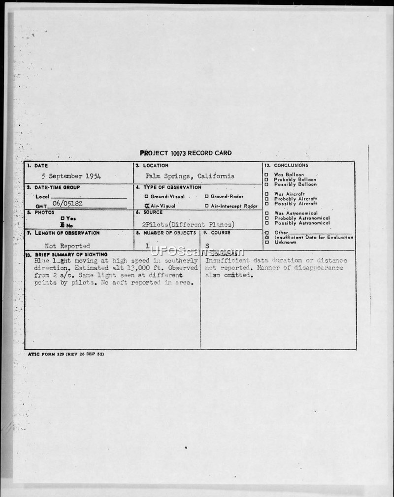 Two pilots reported a high-speed blue light near Palm Springs, California, on September 5, 1954. The official conclusion was that insufficient data existed to evaluate the sighting.