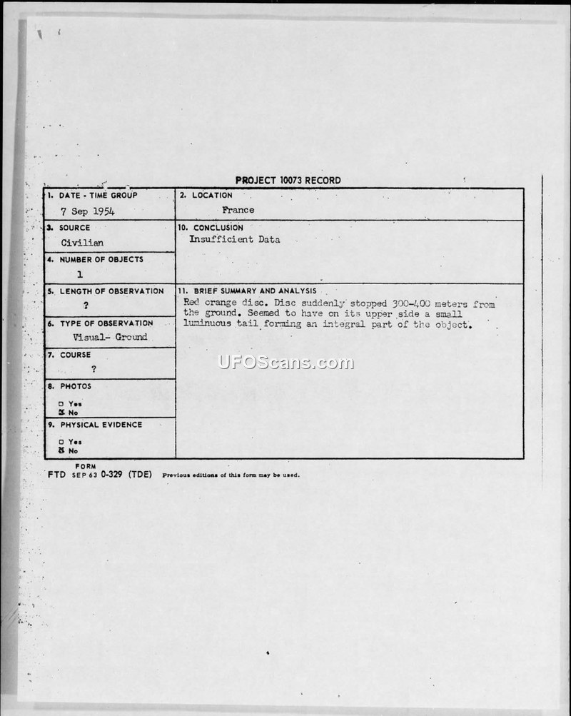 Extract of UFO Sightings in Europe (31 July - 20 September 1954)