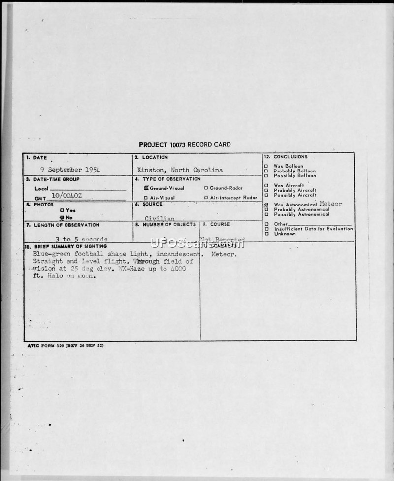Project 10073 Record Card — Kinston, North Carolina, 9 September 1954