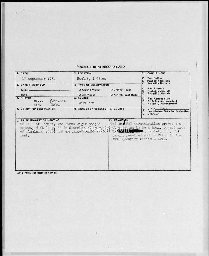 A 1954 report of a cigar-shaped object in Hamlet, Indiana, was investigated by the FBI and OSI and officially determined to be a hoax created by a local resident.