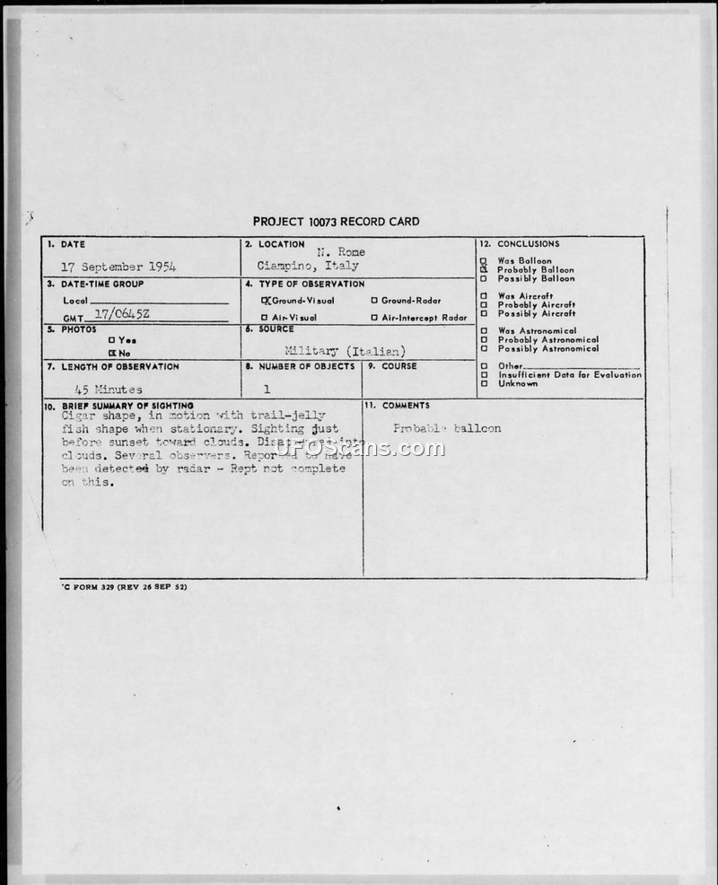PROJECT 10073 RECORD CARD — Ciampino, Italy, 17 September 1954