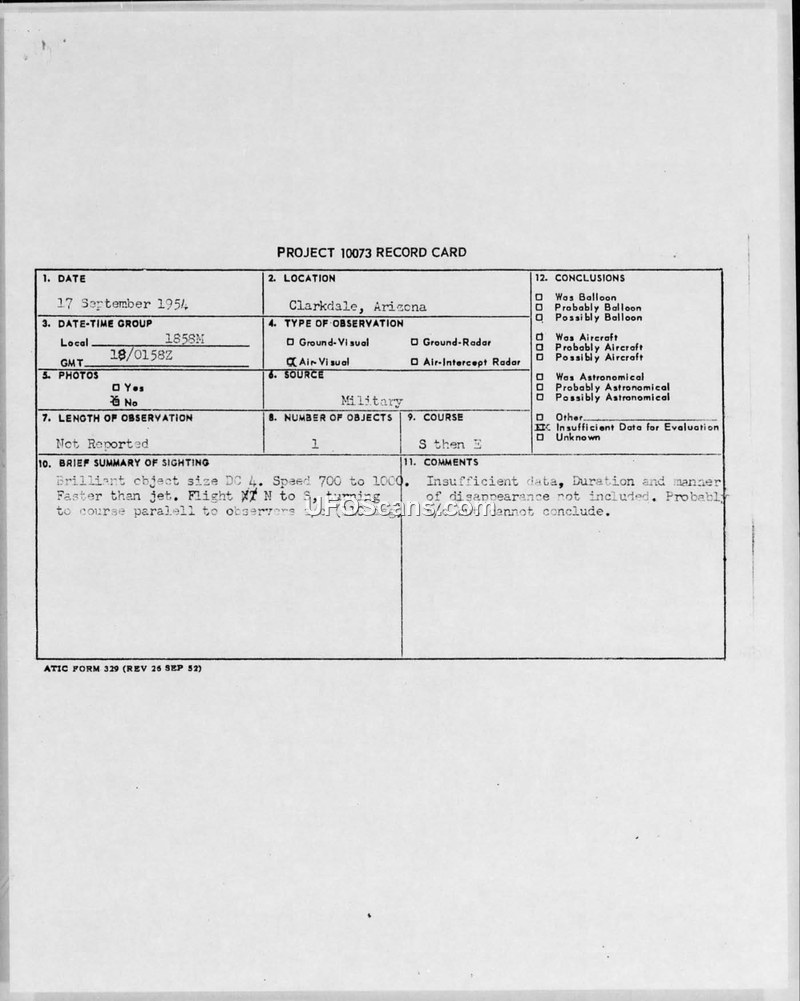 Project 10073 Record Card — Clarkdale, Arizona, 17 September 1954