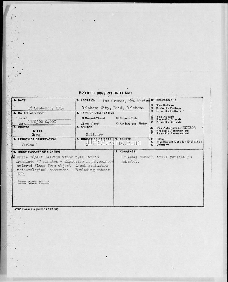 This document collection contains Air Intelligence Information Reports and a Project 10073 record card detailing a series of sightings on September 18, 1954, involving a luminous object observed in New Mexico and Oklahoma. The primary incident involved a white object that left a persistent vapor trail, described by witnesses as having an explosive brilliance and rainbow-colored flames. The object was observed by multiple individuals, including military personnel and pilots, moving in a south-to-north direction at high speeds, estimated between 2,000 and 4,000 mph. Witnesses reported the object appeared as a triangular formation of lights. The reports note that the object did not change direction and left no evidence of exhaust or propulsion. The investigation, conducted by the Air Intelligence Service Squadron and reviewed by the Air Technical Intelligence Center, concluded that the phenomenon was likely an unusual meteor or a meteorological event. The reports also reference a broader public excitement surrounding 'green fireballs' during this period, noting that Dr. Lincoln La Paz of the University of New Mexico commented on the unusual nature of these sightings. Despite the detailed accounts from trained observers, including pilots and navigators, the official Air Force position remained that the sightings were meteorological in nature, possibly involving optical illusions or light reflections on moving objects. The documentation includes sketches of the sighting and detailed logs of weather conditions and air traffic in the area at the time of the events.