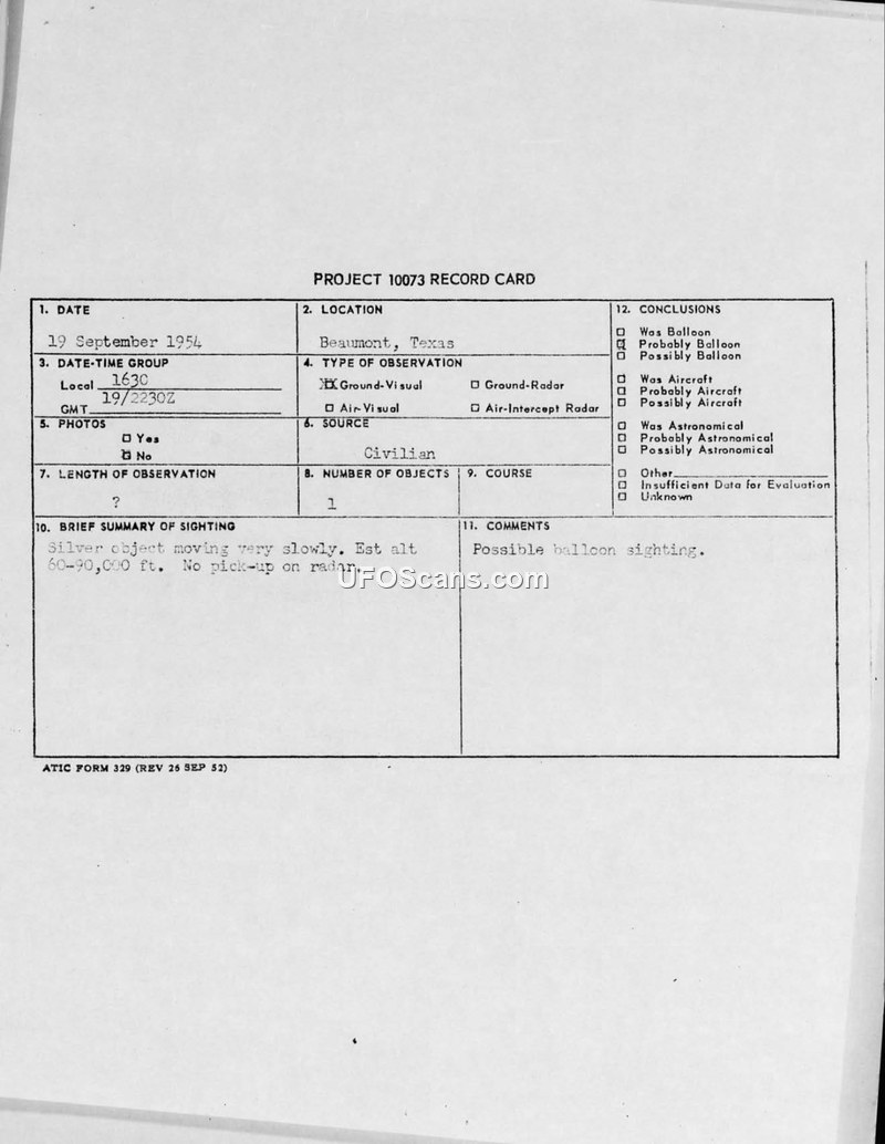 This document records two UAP sightings near Beaumont, Texas, in September 1954. One was attributed to a possible balloon, while the other, involving military witnesses, was attributed to a brilliant star.