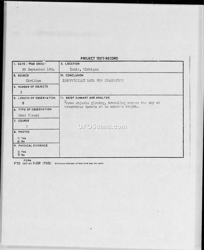 Project 10073 Record — Ionia, Michigan, 20 September 1954