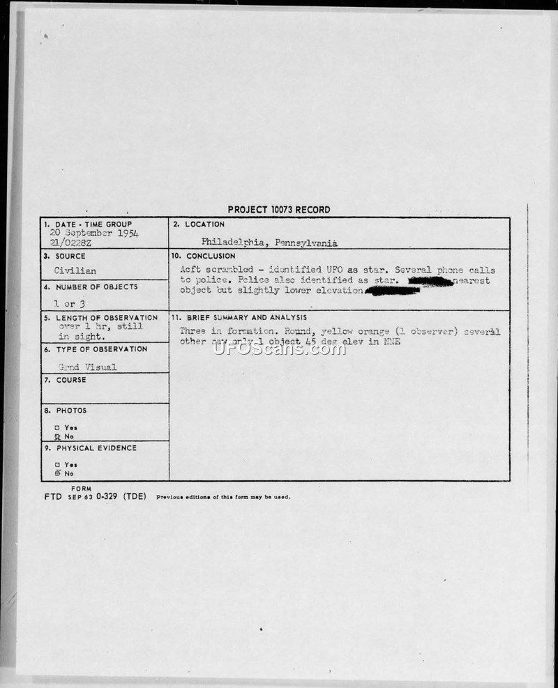 Project 10073 Record — Philadelphia, Pennsylvania, 20 September 1954