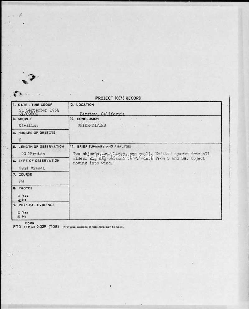 This document is a Project 10073 record detailing an unidentified aerial phenomenon sighting that occurred on September 21, 1954, in Barstow, California. The report documents an observation involving two objects, one large and one small, which were visible for approximately 20 minutes. Witnesses, including a member of the Barstow Police Department and personnel from the Provost Marshall's Office at the Marine Corps Depot, described the objects as being reddish-orange in color and roughly the size of a softball. The objects were observed moving into the wind and performing a zig-zag descent toward the west. A notable feature reported was that the objects emitted sparks from all sides, and a smaller light, which appeared to be separate from the main body, was seen moving in conjunction with it. The report confirms that no photographs were taken and no physical evidence was recovered. Radar contact was explicitly noted as negative. The final conclusion recorded on the form is 'UNIDENTIFIED'. The document includes teletype communications received by an operations officer with the flight service from the Daggett INSAC radio station, indicating that the observers were contacted regarding the event. The report serves as a formal record of the incident within the framework of the Air Force's investigation into unidentified aerial phenomena during the mid-1950s.