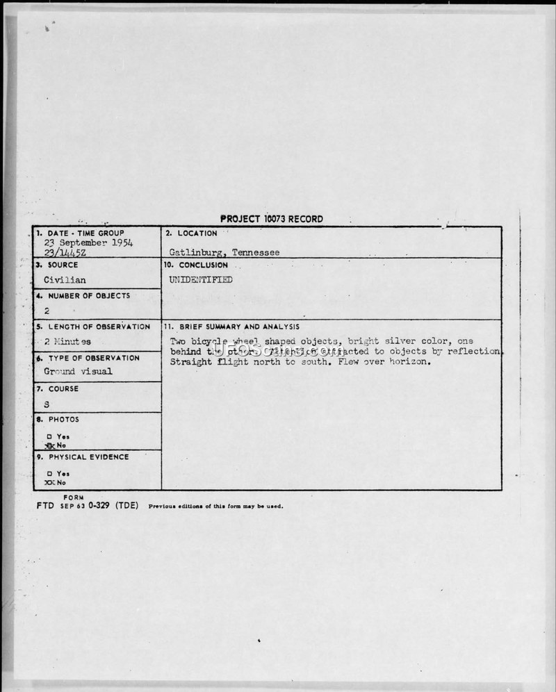 Project 10073 Record — Gatlinburg, Tennessee, 23 September 1954