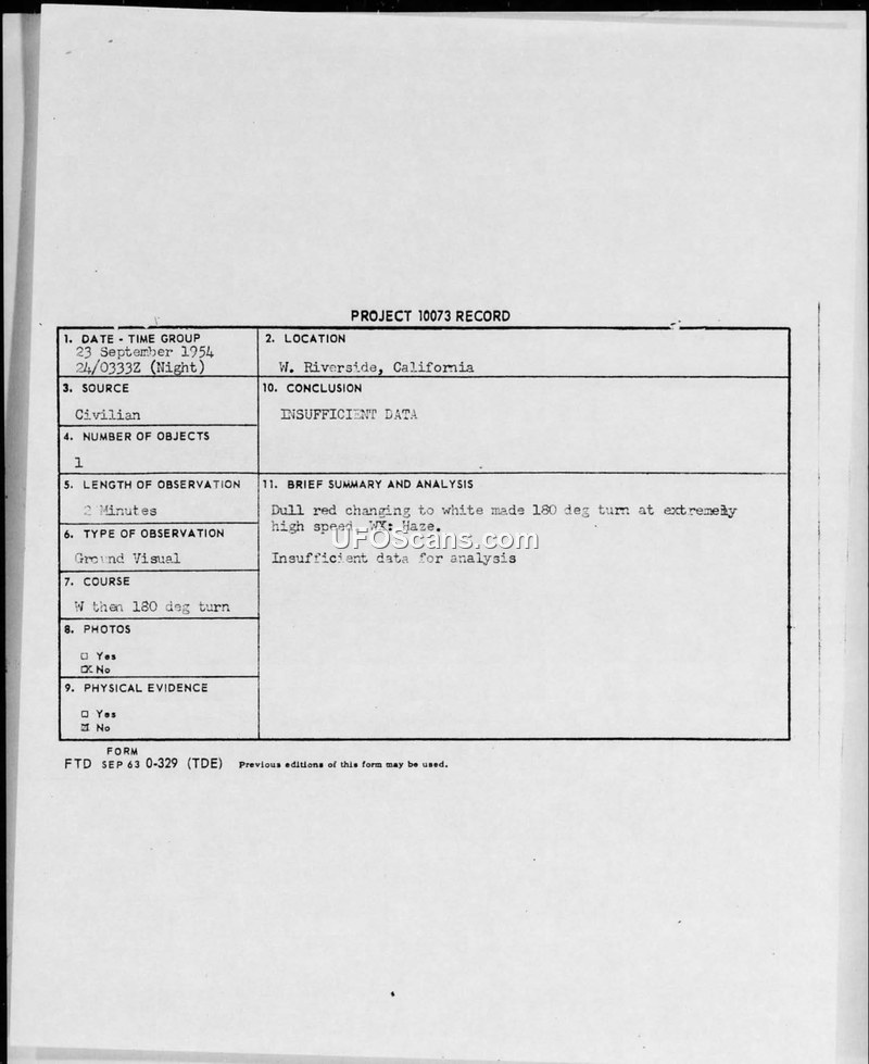 This document is a Project 10073 record concerning a civilian sighting of an unidentified aerial phenomenon in West Riverside, California, on September 23, 1954. The observer reported a single object that appeared as a dull red light, which subsequently changed to white. The object was observed for approximately one to two minutes, during which it performed a 180-degree turn at an extremely high speed before disappearing suddenly. The weather conditions at the time were reported as clear and unlimited, with visibility of five miles in haze. The report includes administrative routing information, indicating that the sighting was communicated to the Air Technical Intelligence Center (ATIC) at Wright-Patterson Air Force Base, as well as the 27th Air Division Defense and the Director of Intelligence at HQ USAF. Meteorological data from March Air Force Base was included in the assessment. Despite the details provided, the official conclusion reached by the investigating authorities was that there was insufficient data to conduct a meaningful analysis of the event. The report confirms that no photographs or physical evidence were obtained, and there was no radar contact associated with the sighting.