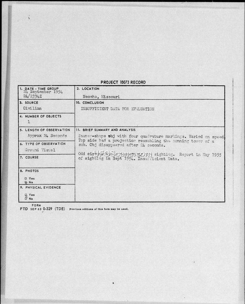 A civilian witness reported a 24-second sighting of a saucer-shaped object with a conning-tower-like projection near Camp Crowder, Missouri, in 1954. The Air Force concluded there was insufficient data for a formal evaluation.