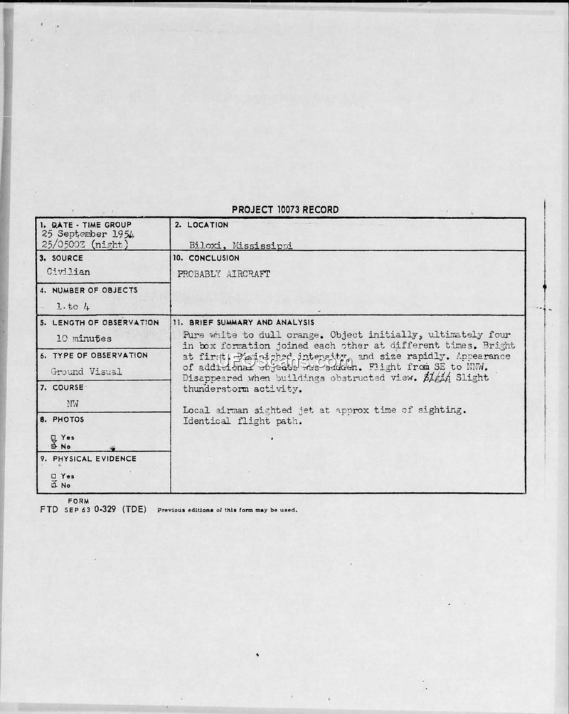 This document is a Project 10073 record detailing a UFO sighting that occurred on September 25, 1954, at 0500Z in Biloxi, Mississippi. The witness, a 32-year-old civilian radar instructor at Keesler AFB Technical Schools, observed between one and four objects for approximately ten minutes. The objects were described as appearing like the head of a pin, initially pure white to dull orange, and extremely bright. The witness reported that the objects joined each other at different times to form a box formation. The flight path was observed from the southeast to the north-northwest, ending when the objects were obscured by buildings. The weather conditions at the time included slight thunderstorm activity and intermittent lightning to the southeast of the base. Although the Keesler AFB tower reported no air traffic in the immediate area, a local airman claimed to have heard a jet and seen navigation lights on an aircraft following an identical flight path at approximately the same time. The official conclusion recorded on the form is 'Probably Aircraft,' yet the investigating officer from Wing Plans and Programs explicitly stated that the analysis of factors and the interrogation of the witness offered no logical explanation for the sighting. The report was submitted in compliance with paragraph 7 of AFR 220-2.