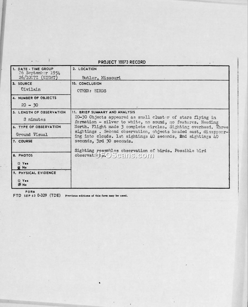 A 1954 sighting of 20-30 star-like objects in Butler, Missouri, was investigated by the Air Technical Intelligence Center. The official conclusion attributed the phenomenon to birds.