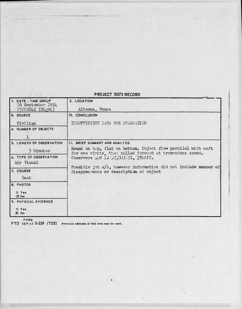PROJECT 10073 RECORD — Altoona, Penna, 26 September 1954
