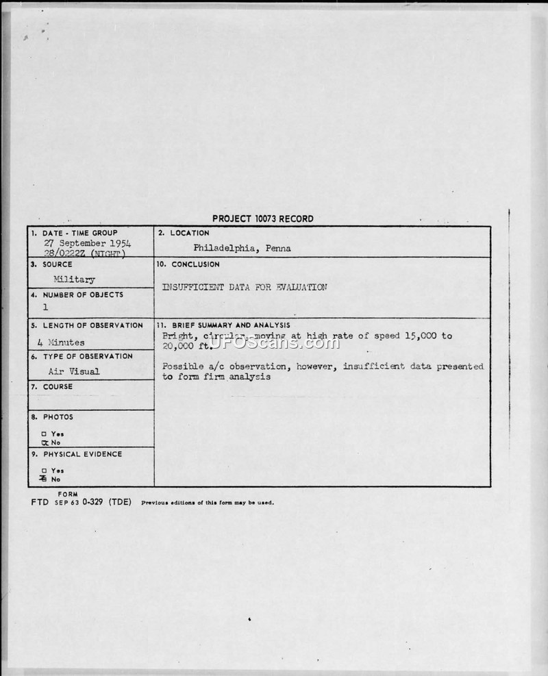 Project 10073 Record — Sighting near Philadelphia, Pennsylvania, 27 September 1954