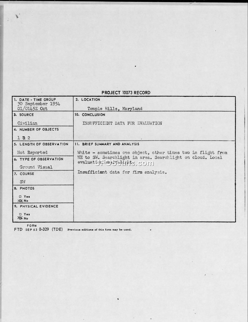 Project 10073 Record — Temple Hills, Maryland, 30 September 1954