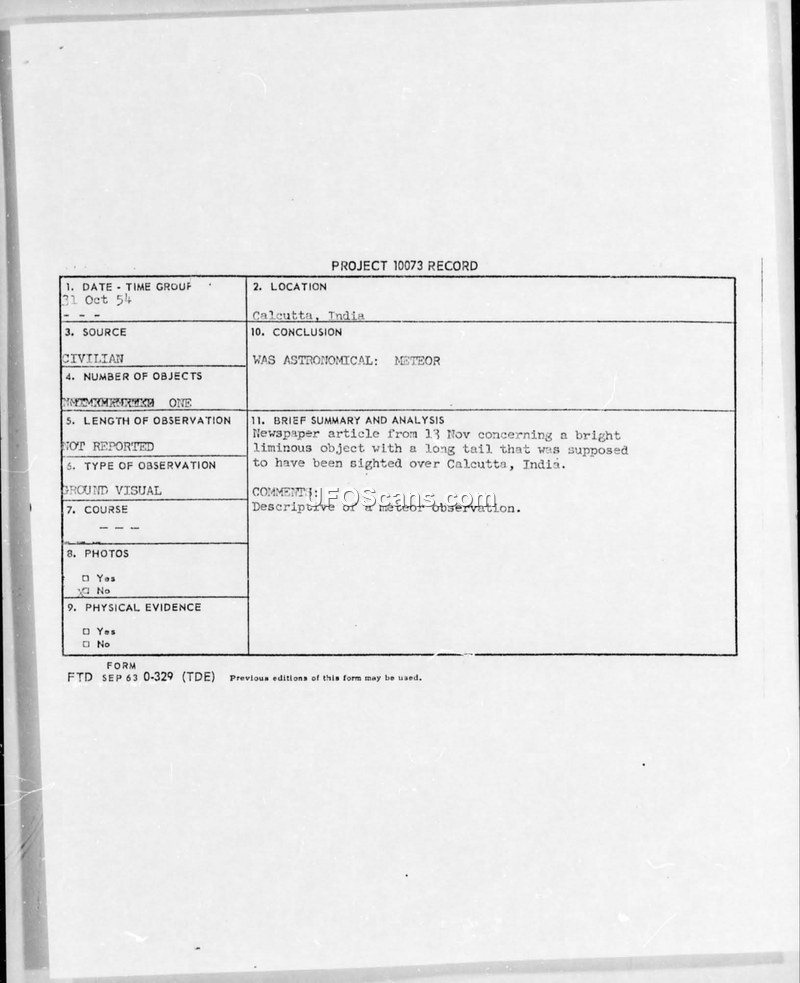 PROJECT 10073 RECORD — Calcutta, India, 31 Oct 54
