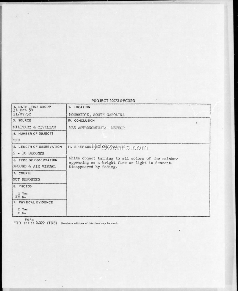 A sighting of a bright, multi-colored light in descent over Monbridge, South Carolina, on October 31, 1954, was officially identified as a meteor. The report was compiled by USAF personnel and includes observations from multiple civilian aviation radio operators.