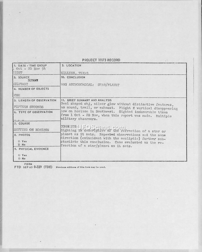 Project 10073 Record: Sighting Report - Killeen, Texas