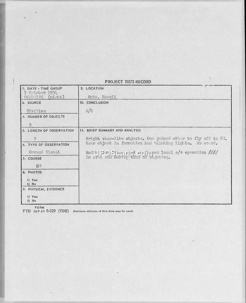 This document is a Project 10073 record concerning a UFO sighting reported on 7 October 1954 near Oahu, Hawaii. A civilian witness reported observing two bright, star-like objects. According to the report, one object joined the other, and they proceeded to fly in a northwesterly direction. The witness noted that the rear object in the formation displayed blinking lights, and no sound was heard during the observation. The objects were observed climbing from two degrees above the horizon to three degrees before disappearing. The report includes coordinates for the sighting at 21-35N 158-17W. Following the initial report, military authorities conducted an investigation. Communication with local radio stations and military units confirmed that there was local jet aircraft activity in the area during the time of the sighting. Consequently, the official conclusion reached by the intelligence division was that the objects were local jet aircraft engaged in routine operations. The report explicitly states that there was no physical evidence, no photographs, and no radar contact associated with the incident. The weather conditions at the time were reported as 15 miles visibility with 2500 feet scattered clouds.