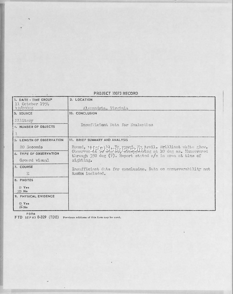 This document is a Project 10073 record detailing an Unidentified Aerial Phenomena (UAP) sighting that occurred in Alexandria, Virginia, on 11 October 1954. The observation, which lasted approximately 20 seconds, involved a single, small, round object emitting a brilliant white glow. The witness, who possessed sea navigational experience, reported that the object made no sound and left no trail. It was initially observed at 70 degrees azimuth and eventually disappeared at 10 degrees azimuth, having reportedly maneuvered through 350 degrees. Weather conditions at the time were described as clear. The report notes that an aircraft was in the area during the sighting. Ultimately, the official conclusion reached by the project was that there was insufficient data for a proper evaluation, particularly because specific details regarding the object's maneuverability were missing from the report. The document includes administrative markings and references to FTD (Foreign Technology Division) forms.