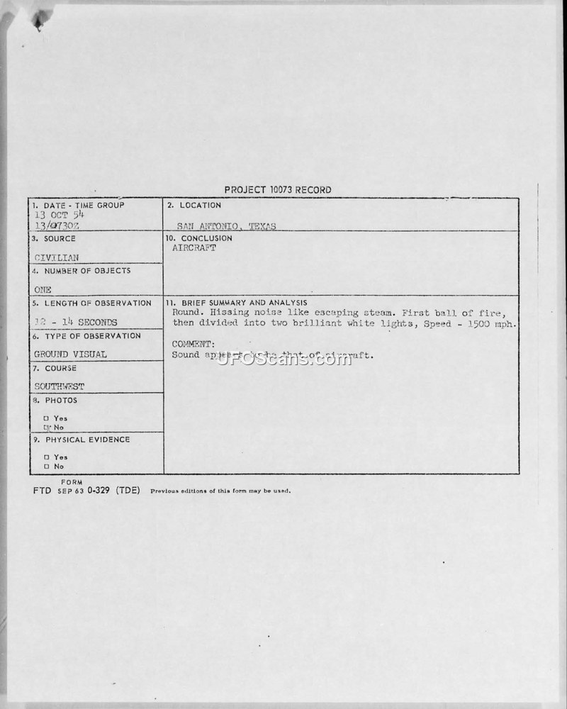 Project 10073 Record — San Antonio, Texas, 13 October 1954