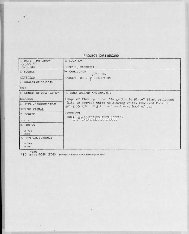 Project 10073 Record — Festus, Missouri, 13 October 1954