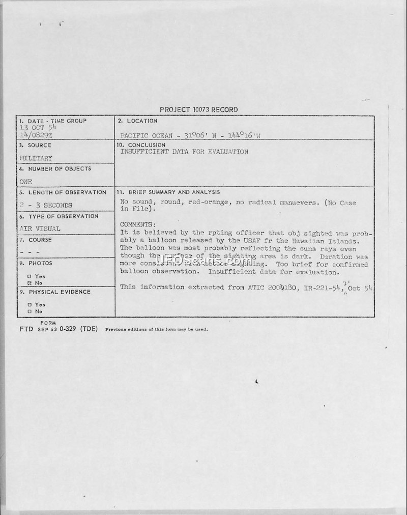 This document is a Project 10073 record detailing an aerial sighting that occurred on October 13, 1954, at 0829Z. The observation took place over the Pacific Ocean at coordinates 31°06' N - 144°16'W. A single object was observed for a duration of two to three seconds. The object was described as round, red-orange in color, and silent, with no radical maneuvers reported. The reporting officer suggested that the object was likely a balloon released by the United States Air Force from the Hawaiian Islands, noting that it may have been reflecting the sun's rays despite the darkness of the sighting area. Alternatively, the officer noted that the duration of the sighting was more consistent with a meteor. Ultimately, the report concludes that the observation was too brief for confirmation and that there was insufficient data for a formal evaluation. The information was extracted from ATIC report 200180, IR-221-54.