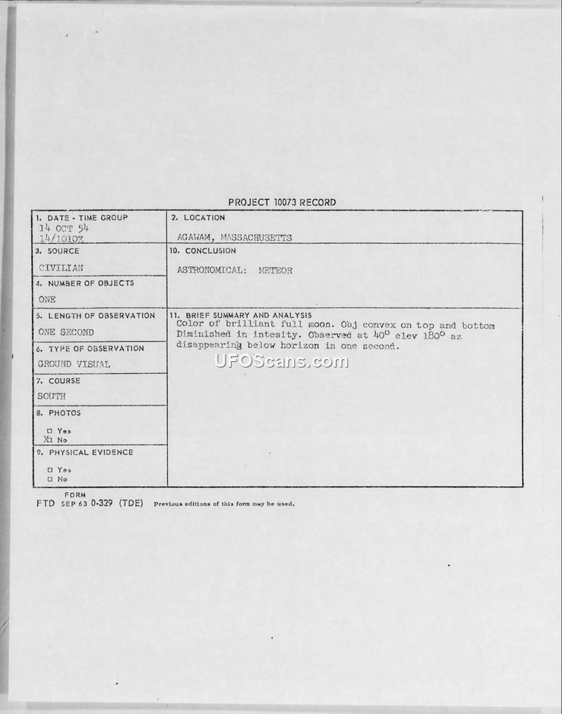 A civilian witness reported a bright, moon-colored object in Agawam, Massachusetts, on October 14, 1954. The Air Force officially classified the sighting as a meteor.