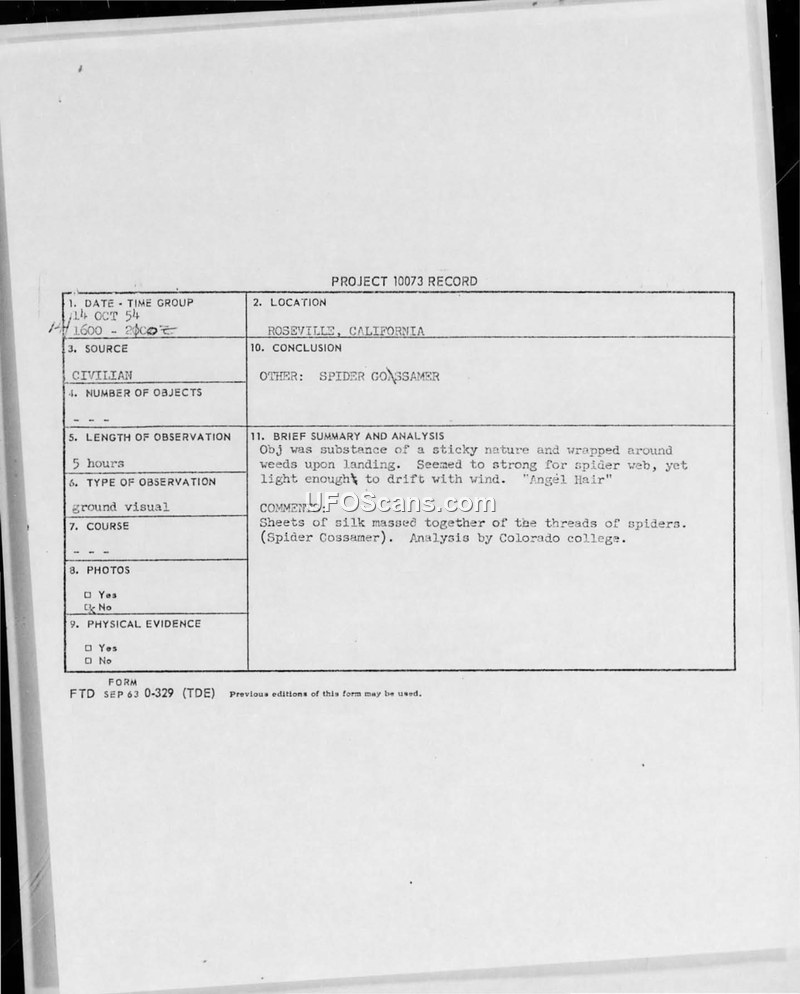 A civilian reported a sticky, white substance falling from the sky in Roseville, California, in 1954. Analysis by Colorado College identified the material as spider gossamer.