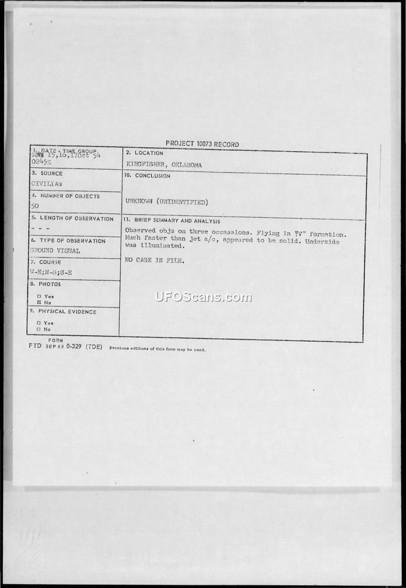 A 1954 report from Kingfisher, Oklahoma, documents a civilian sighting of 50 unidentified objects in a V formation. The objects were described as solid, illuminated, and faster than jet aircraft, ultimately remaining unidentified.