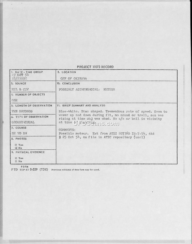 A sighting report from October 1954 regarding a blue-white, disc-shaped object observed off the coast of Okinawa. The official conclusion identifies the object as a possible meteor.