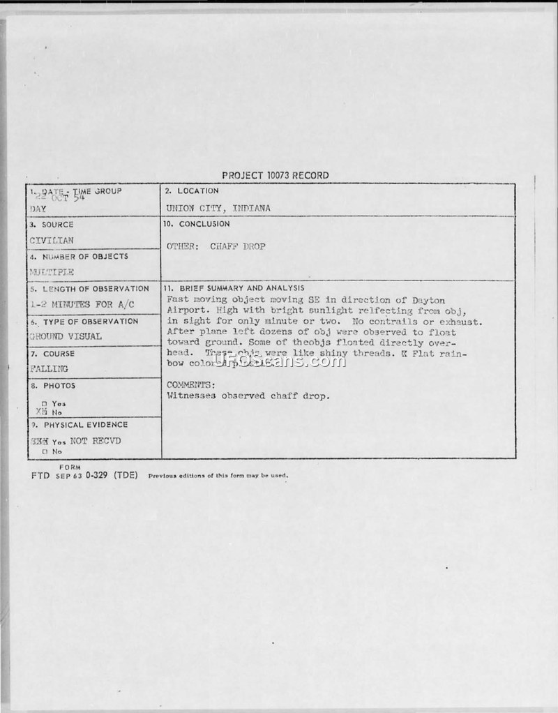 A civilian reported a sighting of unidentified objects in Union City, Indiana, in 1954, which were later officially identified by the Air Force as a chaff drop.