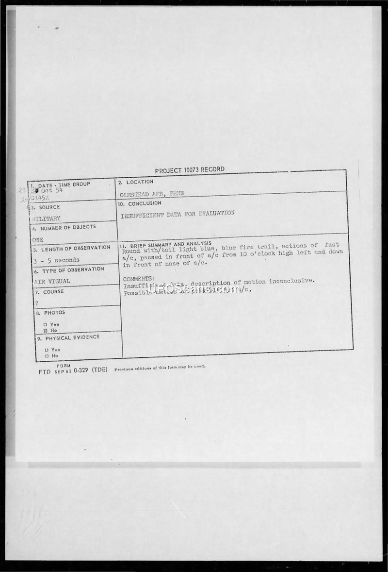 This document is a Project 10073 record detailing an unidentified aerial phenomenon sighting that occurred on October 24, 1954, at 0145Z near Olmstead Air Force Base in Pennsylvania. The report describes a single, round, light blue object, estimated to be the size of a baseball, which exhibited a blue fire trail. The object was observed for a duration of three to five seconds. According to the report, the object moved from a 10 o'clock high left position, passing down in front of the nose of the observer's aircraft. The weather conditions at the time were reported as clear with unlimited visibility. The official conclusion reached by the evaluating authorities was that there was insufficient data to provide a definitive evaluation of the sighting. The report notes that the object could potentially have been a meteor or a jet aircraft, but the description of its motion remained inconclusive. An operations officer at the Olmstead Flight Service conducted a review of all possibilities, but no explanation was forthcoming. The document includes standard reporting fields for sighting incidents, including the date, time, location, and physical characteristics of the object, as well as administrative routing information for various military intelligence and defense units.