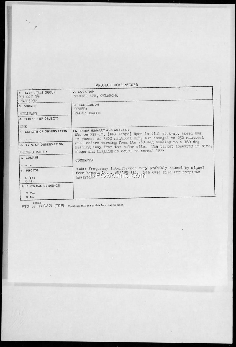 Project 10073 Record — Tinker AFB, Oklahoma, 23 October 1954