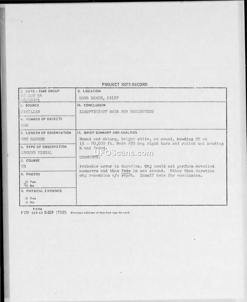 This document is a Project 10073 record detailing an unidentified aerial phenomenon sighting that occurred on October 26, 1954, at 2032Z in Long Beach, California. The witness, identified as Lieutenant Gifford of the U.S. Naval Shipyard, reported observing a single, round, and oblong object that was bright white in color. The object was silent and initially heading northeast at an estimated altitude of 15,000 to 20,000 feet. According to the report, the object executed a 270-degree right turn and rolled out on a northerly heading before fading from view. The duration of the observation was recorded as one second. The official analysis of the incident suggests that there was likely an error in the reported duration, as the maneuvers described would be difficult to perform within a single second. The report concludes that the object resembled an aircraft report, but ultimately determined that there was insufficient data to reach a definitive conclusion regarding the nature of the sighting. The document includes routing information to various military commands, including the 2347th Air Reserve Flying Center, the 27th Air Division, the Air Technical Intelligence Center, and the Director of Intelligence at USAF Headquarters.