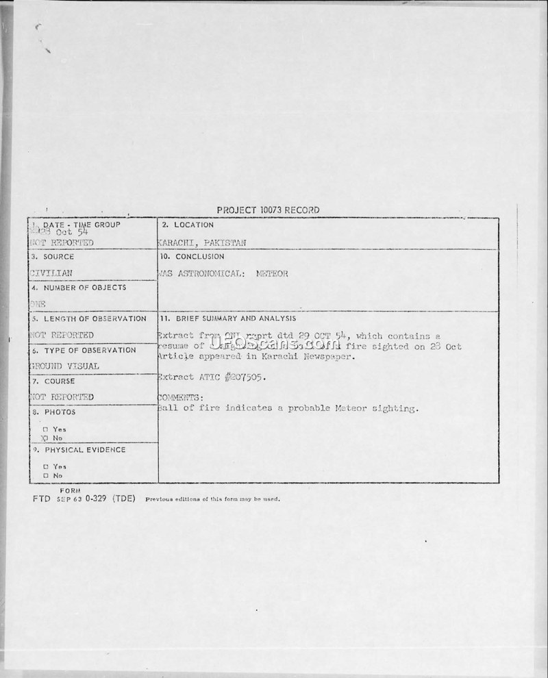Project 10073 Record — Karachi, Pakistan, 23 October 1954