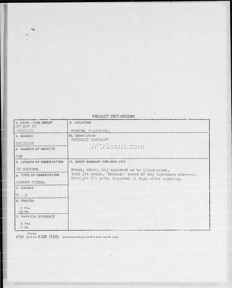 Project 10073 Record: Sighting at Merced, California, 28 October 1954