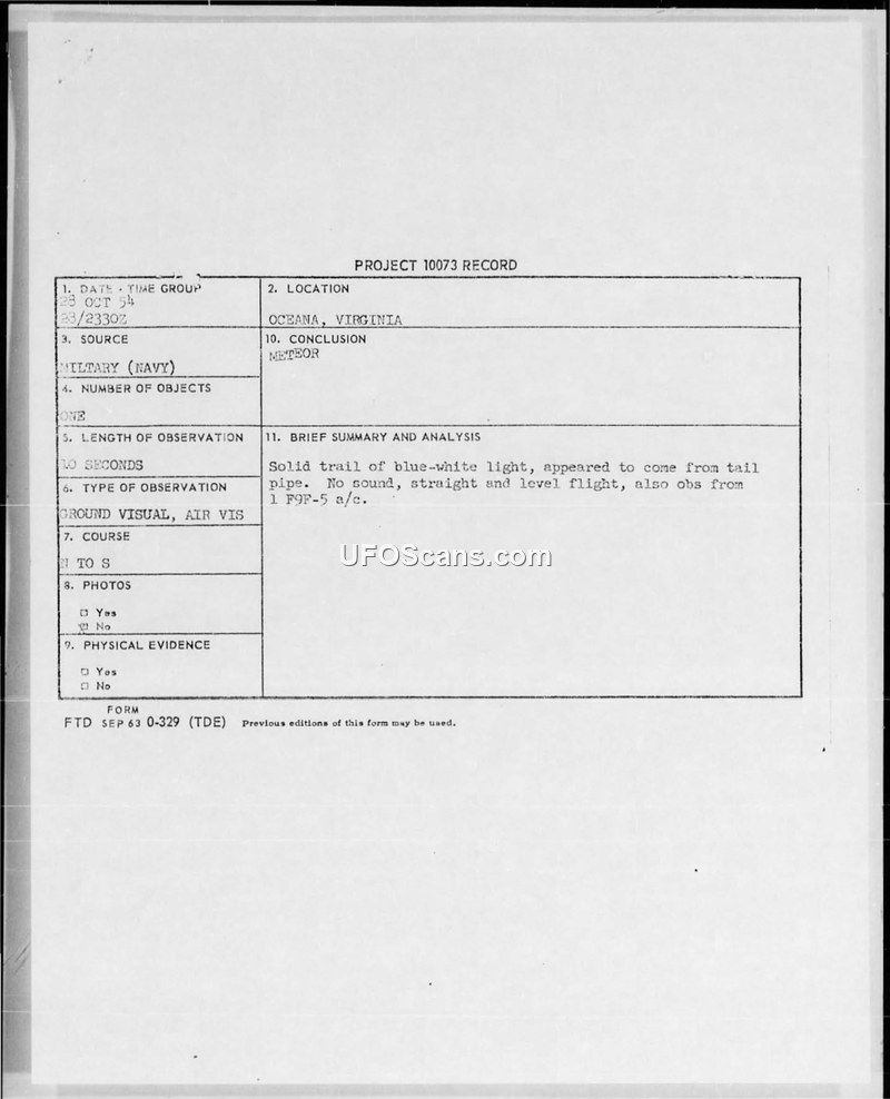 A Navy pilot observed a blue-white light trail over Oceana, Virginia, on October 28, 1954. The official military conclusion for the sighting was that the object was a meteor.