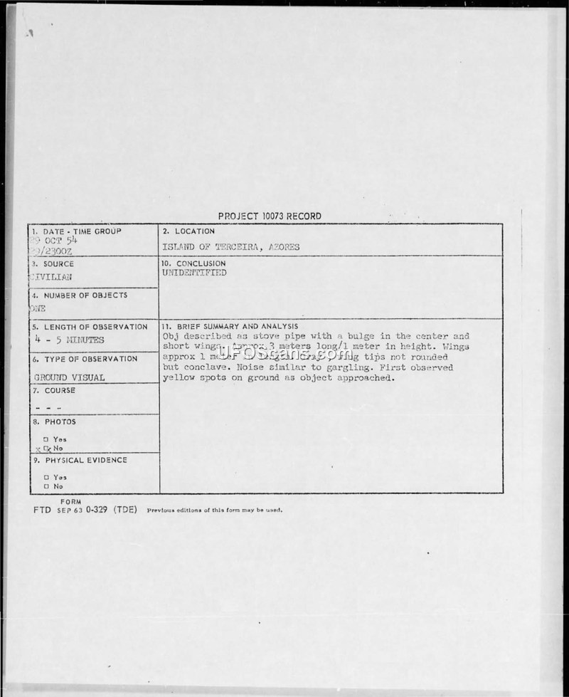 Project 10073 Record — Island of Terceira, Azores, October 1954