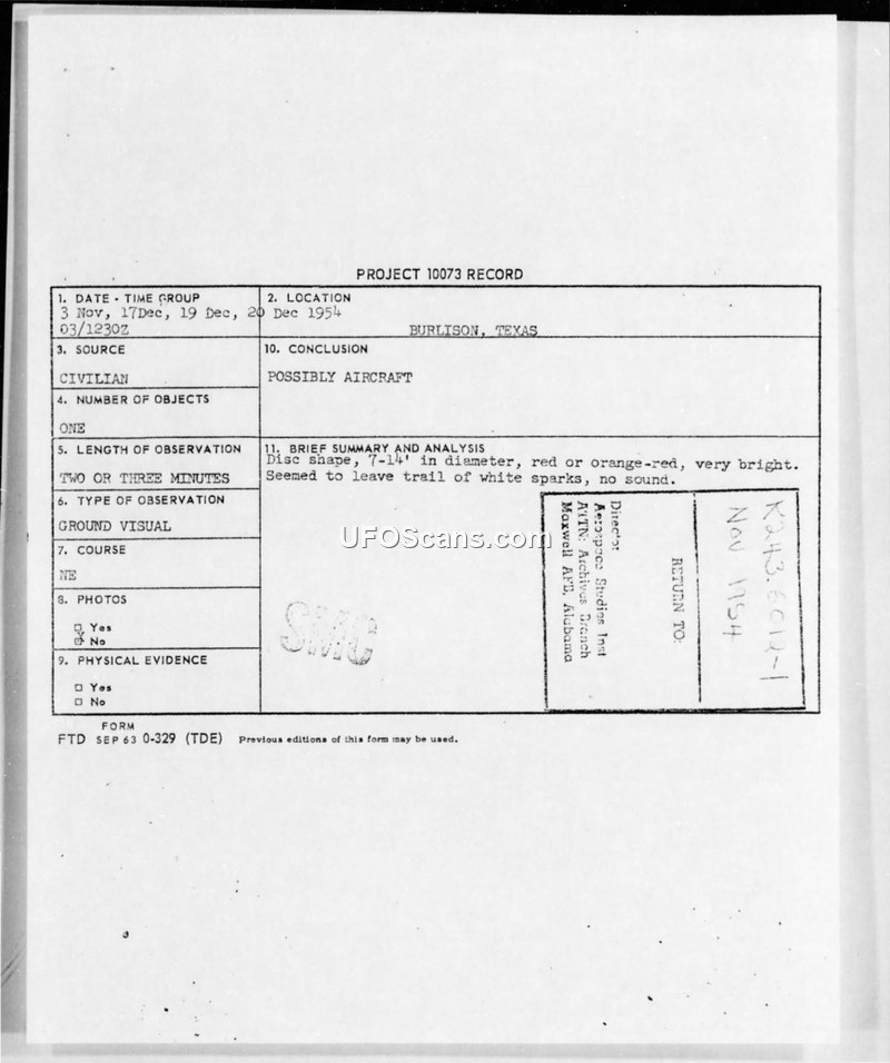 An Air Intelligence report from 1954 documents civilian sightings of a disc-shaped object in Burlison, Texas. The investigating officer concluded the object was likely a low-flying aircraft.