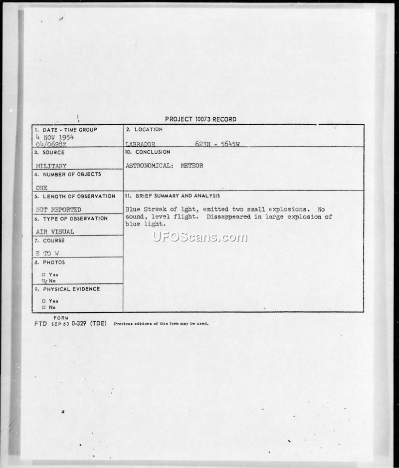 A report from 1954 detailing a sighting of a blue, exploding object in the sky over Labrador by a USAF navigator. The official conclusion of the investigation was that the object was a meteor.